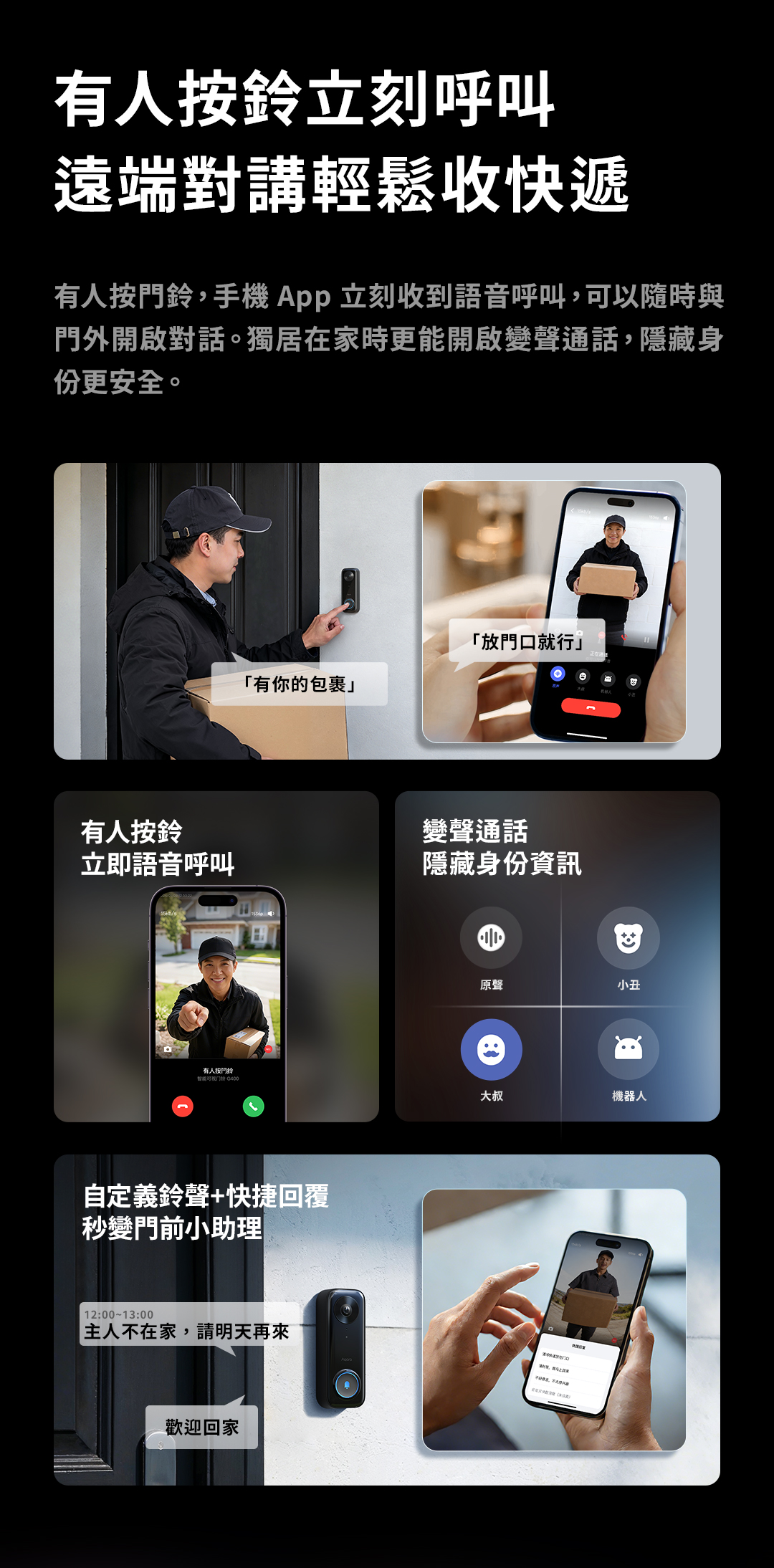 不可以,本產品的室外門鈴和室內響鈴器採用RF433/RF315 MHz窄帶訊號通信,無法發送語音數據,不支援在室內接收器上播放自訂鈴聲