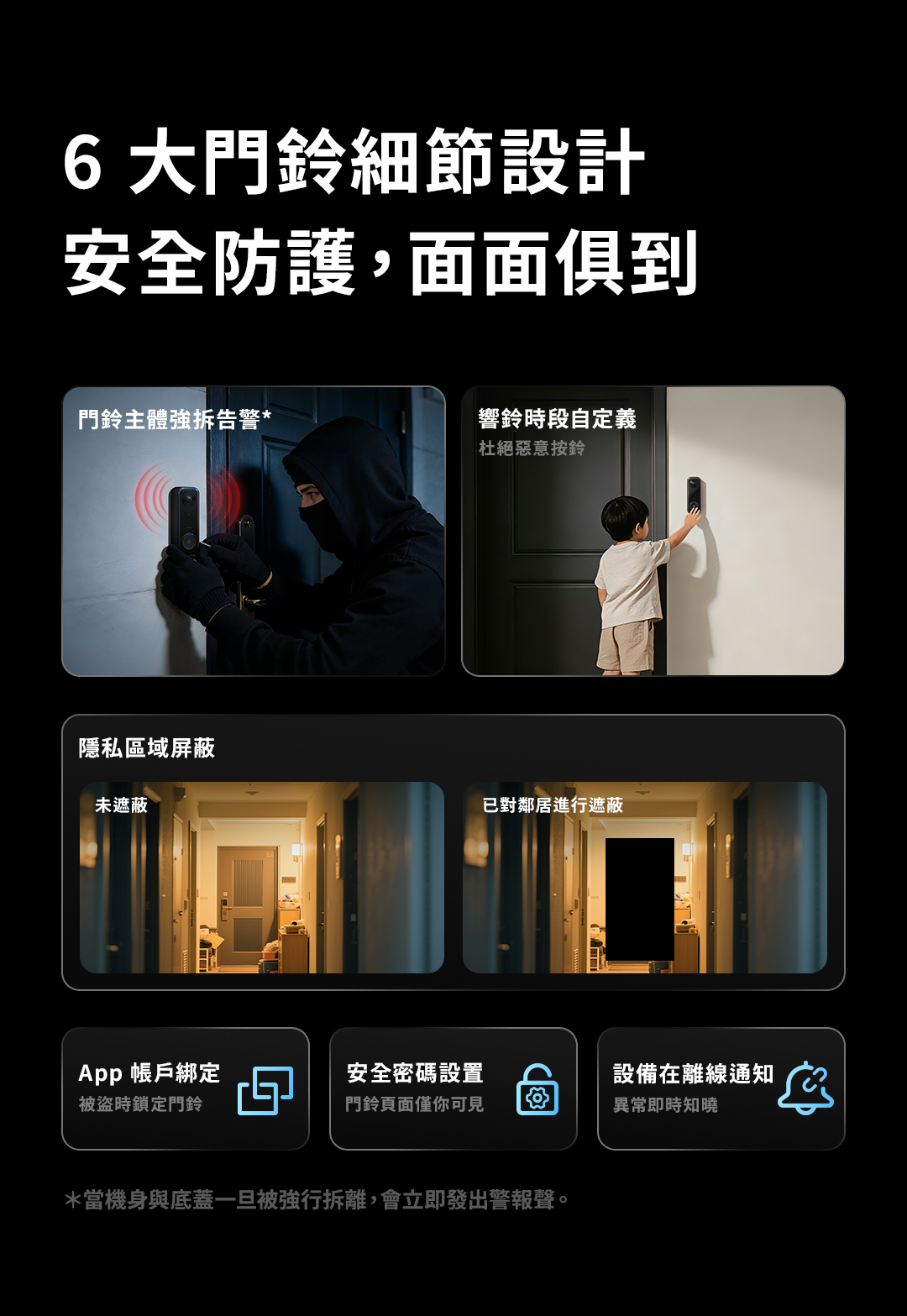 強拆警報是門鈴警報事件中風險等級較高的警報類型,一旦觸發,無法透過裝置本體快速關閉警報狀態(強行拔除電源除外),需進入App設定選單中,在AI偵測功能中關閉強拆警報功能開關,才能結束警報狀態